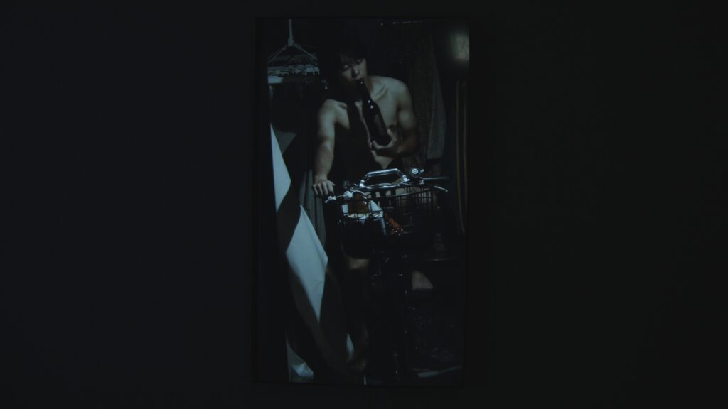 しかし、2011年当時、福島県いわき市の高校生だった渡邉洵は、まったく告発的ではない仕方で作品をつくってきた。なによりもまず、映像にしてもパフォーマンスにしても、作品のなかの渡邉の目線はうつろなのだ。こちらを見ていない。2020年の展覧会「遊園地都市の進化」で再演された《原発ジプシー》(初演は2017年)の際、ビール瓶を笛のように吹きながら自転車を漕ぎつづける彼は、どこかに移動することもなく——ペダルとつながった後輪が地面に触れていないので前進することはない——、そもそも鑑賞者がいることに気がついていないかのようだった。周囲をウロウロしてみて彼の視線の先にまわり込んでみても、その表情に変化はない。車輪が浮いているからどこにも辿り着けないのと同じように、彼自身の存在が、鑑賞者とは違う場所にあるようだった。