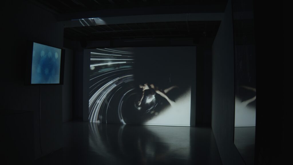 個展会場には、作者である彼も在廊していた。そのときに最も不気味だったのは、スクリーンの前で、つまり作品の外で、作品解説をする姿だった。解説をする、とは、状況を客観的に理解して言語化することだ。しかし、説明をする彼が「状況を客観的に見ている」とは、とうてい思えなかったのである。彼の後ろには映像が投影されていて、そこには疲れ果てながら踊る渡邉の姿が映し出されている。その前で作品解説をする彼の不気味さとは、幽霊が、自分が幽霊であることを忘れて、意気揚々とおしゃべりをしているような——その声は誰にも届かないはずなのに、それでもなぜか僕にだけその声が届いてしまったような——そんな驚異であった。